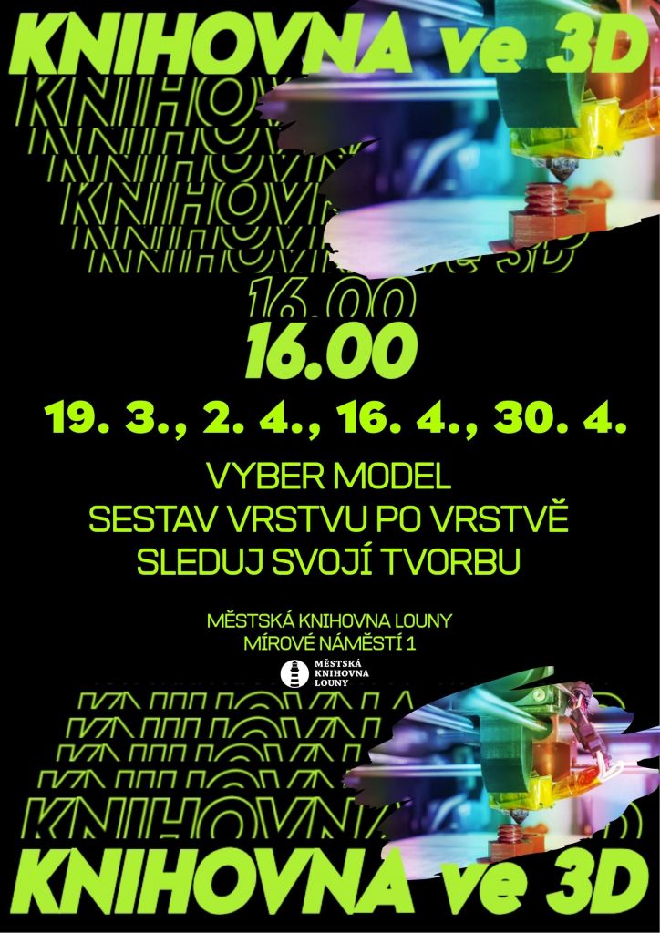 Knihovna ve 3D (16.4.) Termín: 16. 04. 2026 Čas: 16.00 - 18.00 Misto: oddělení studovny Nový kroužek pro všechny zájemce. Vyber si model, sestav vrstvu po vrstvě a sleduji svoji tvorbu na 3D tiskárně. Další dubnové termíny 16. 4. a 30. 4. Vstup zdarma.