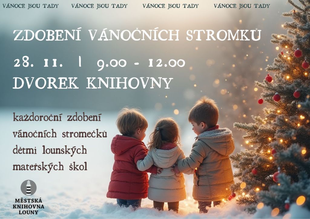 Zdobení vánočních stromků Termín: 28. 11. 2025 Čas: 9.00 - 12.00 Misto: dvorek Každoroční zdobení stromečků dětmi lounských mateřských škol. Výstava po celý advent.