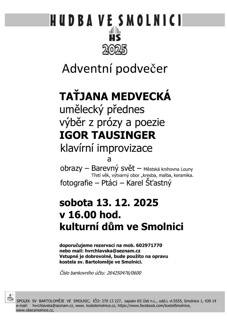 V rámci akce Advent (Taťána Medvecká – umělecký přednes, Igor Tausinger – klavírní improvizace) v kostele sv. Bartoloměje ve Smolnici.