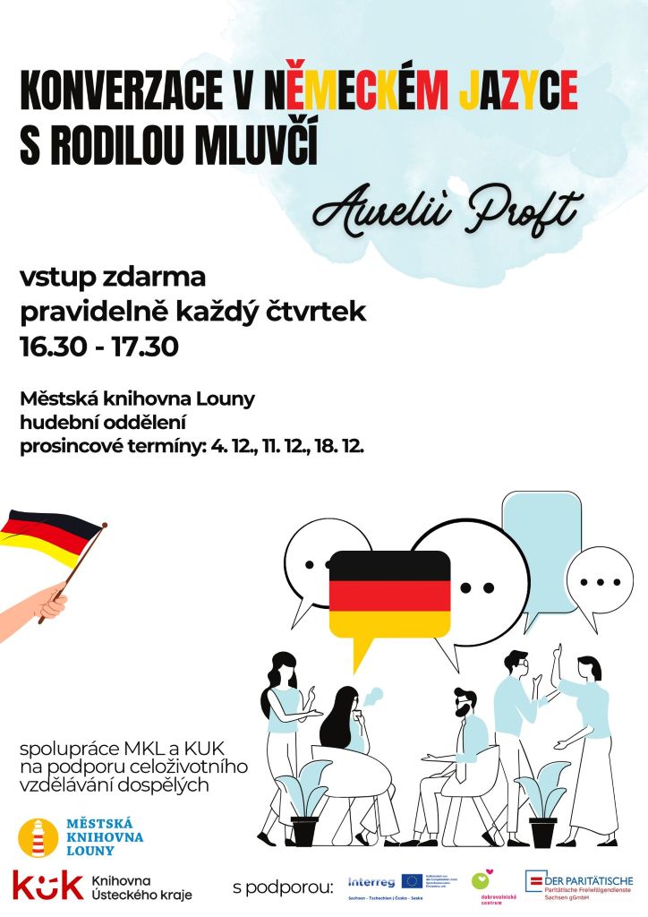 Konverzace v němčině (18.12.) Termín: 18. 12. 2025 Čas: 16.30 – 17.30 Misto: hudební oddělení Pravidelně každý čtvrtek s rodilou mluvčí Aurelií Proft. Ve spolupráci s Knihovnou Ústeckého kraje. Prosincové termíny: 4. 12., 11. 12., 18. 12. Vstup zdarma.