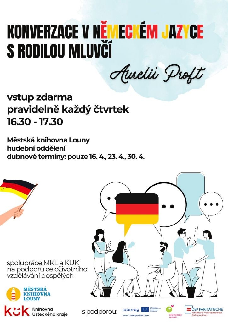 Konverzace v němčině (23.4.) Termín: 23. 04. 2026 Čas: 16.30 – 17.30 Misto: hudební oddělení Pravidelně každý čtvrtek s rodilou mluvčí Aurelií Proft. Ve spolupráci s Knihovnou Ústeckého kraje. Dubnové termíny: 16. 4., 23. 4., 30. 4. Vstup zdarma.
