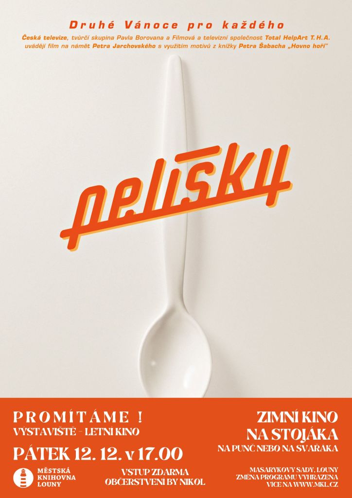 Zimní letní kino – PELÍŠKY Termín: 12. 12. 2025 Čas: 17.00 Misto: letní kino Příběhy jedné historické generace – stárnoucích rodičů, dospívající mládeže a malých dětí. Česko, 1999, 116 min. Zimní kino na stojáka, na čaj nebo na svařáka. Občerstvení zajištěno. Vstup zdarma.