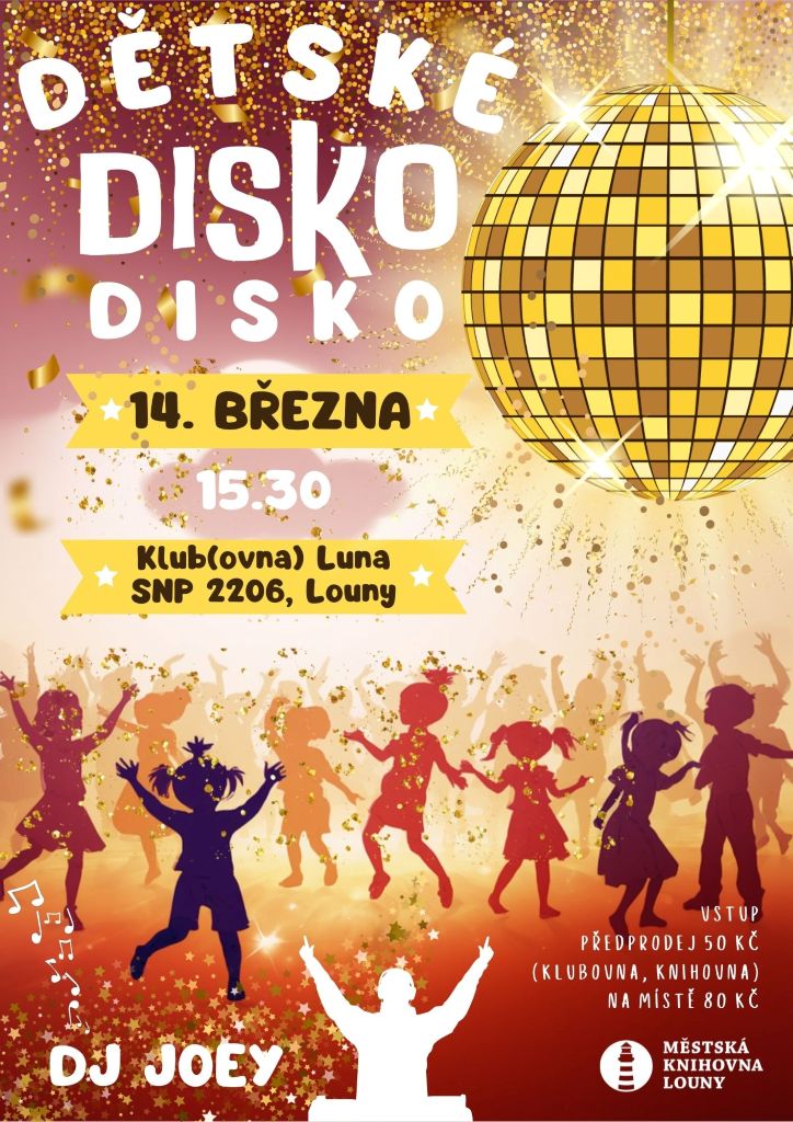 Disko disko Termín: 14. 03. 2026 Čas: 15.30 Misto: Klub(ovna) Luna Odpoledne plné hudby a tance, zábava pro děti. O správnou atmosféru se postará DJ JOEY. Vstupné v předprodeji 50 Kč, na místě 80 Kč.