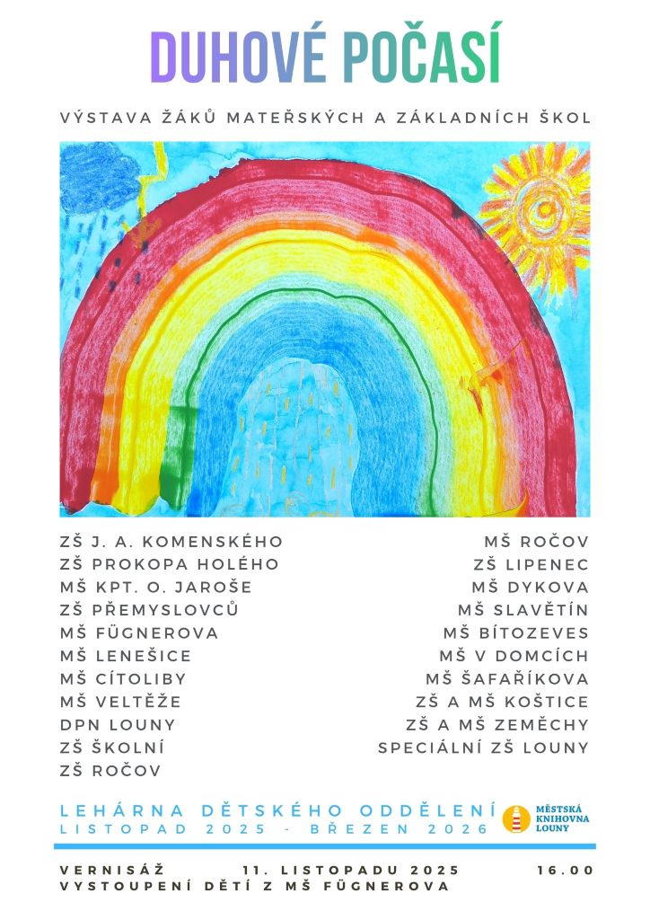 Duhové počasí Termín: od 1. 11. 2025 do 31. 12. 2025 Misto: lehárna Výstava výtvarných prací žáků MŠ a ZŠ na téma „Měnící se počasí během roku“. Vstup zdarma.