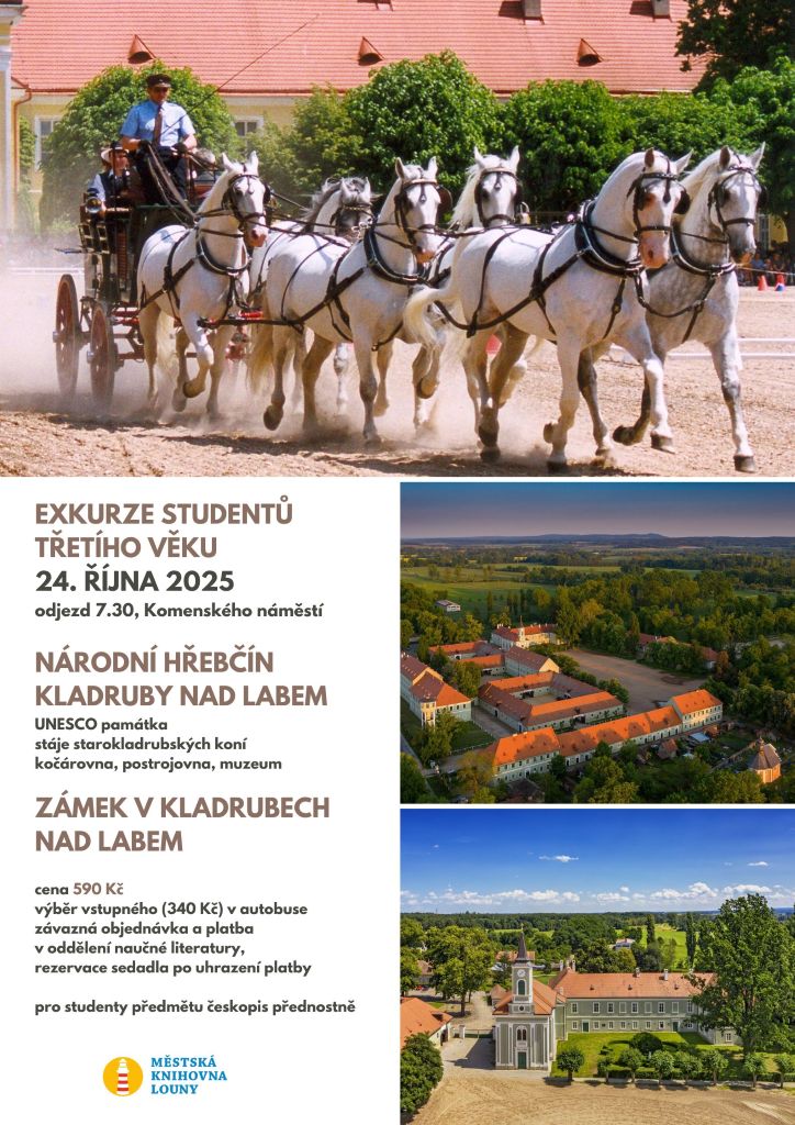 Národní hřebčín Kladruby nad Labem - UNESCO památka, stáje starokladrubských koní, kočárovna, postrojovna, muzeum. Zámek v Kladrubech nad Labem