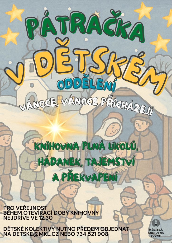 Pátrací hra – Vánoce, Vánoce přicházejí… Termín: od 1. 12. 2025 do 23. 12. 2025 Čas: od 12.30 Misto: dětské a hudební Zábavná pátrací hra ve vánočním duchu pro jednotlivce i školní družiny. Dětské kolektivy nutno předem objednat na detske@mkl.cz nebo 734 521 908. Vstup zdarma.