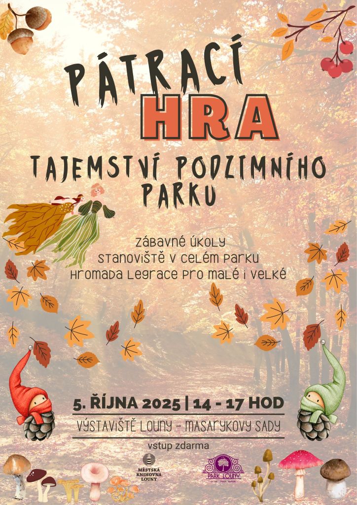 Velká pátrací hra – Tajemství podzimního parku Termín: 5. 10. 2025 Čas: 14.00 - 17.00 Misto: Výstaviště Louny Pro děti. Na účastníky čeká skřítek Podzimníček, kouzelná kniha, ztracené zaklínadlo a dobrodružství mezi stromy. Vstup zdarma.