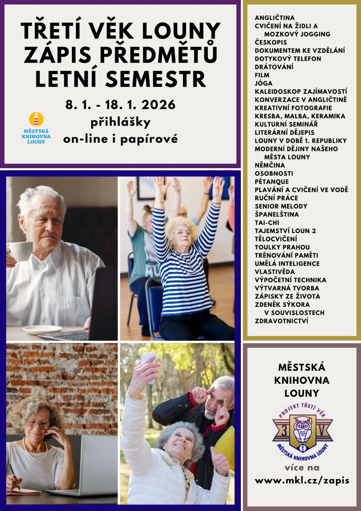 od čtvrtka 8. 1. 2026 začíná zápis předmětů do LETNÍHO SEMESTRU školního roku 2025/2026 projektu Třetí věk Louny - jubilejního 20. ročníku projektu.